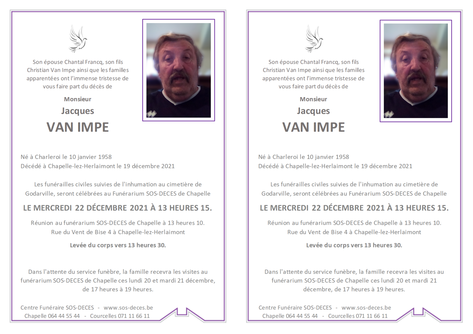 Décédé à Chapelle-lez-Herlaimont le 19 décembre 2021 à l'âge de 63 ans