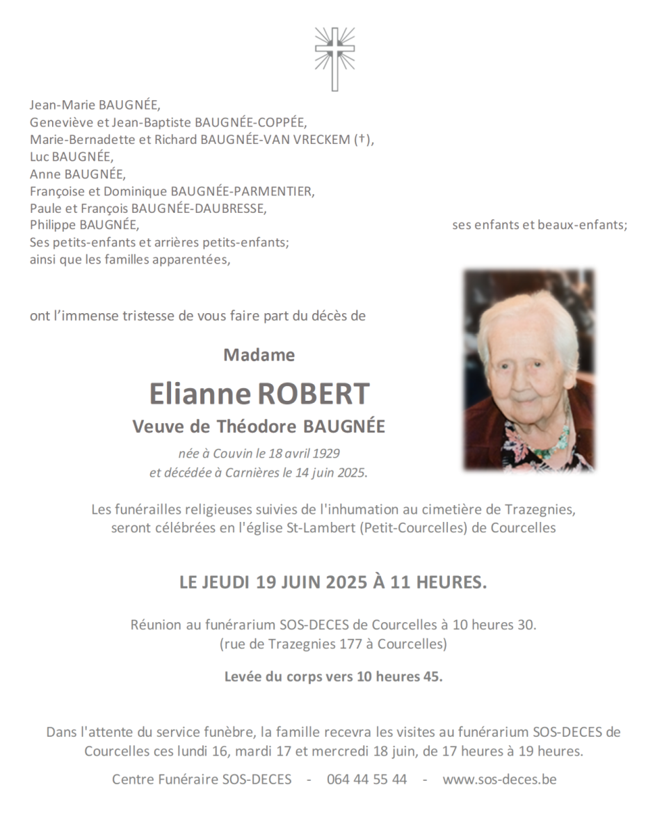 Décédée à Carnières le 14 juin 2025 à l'âge de 96 ans