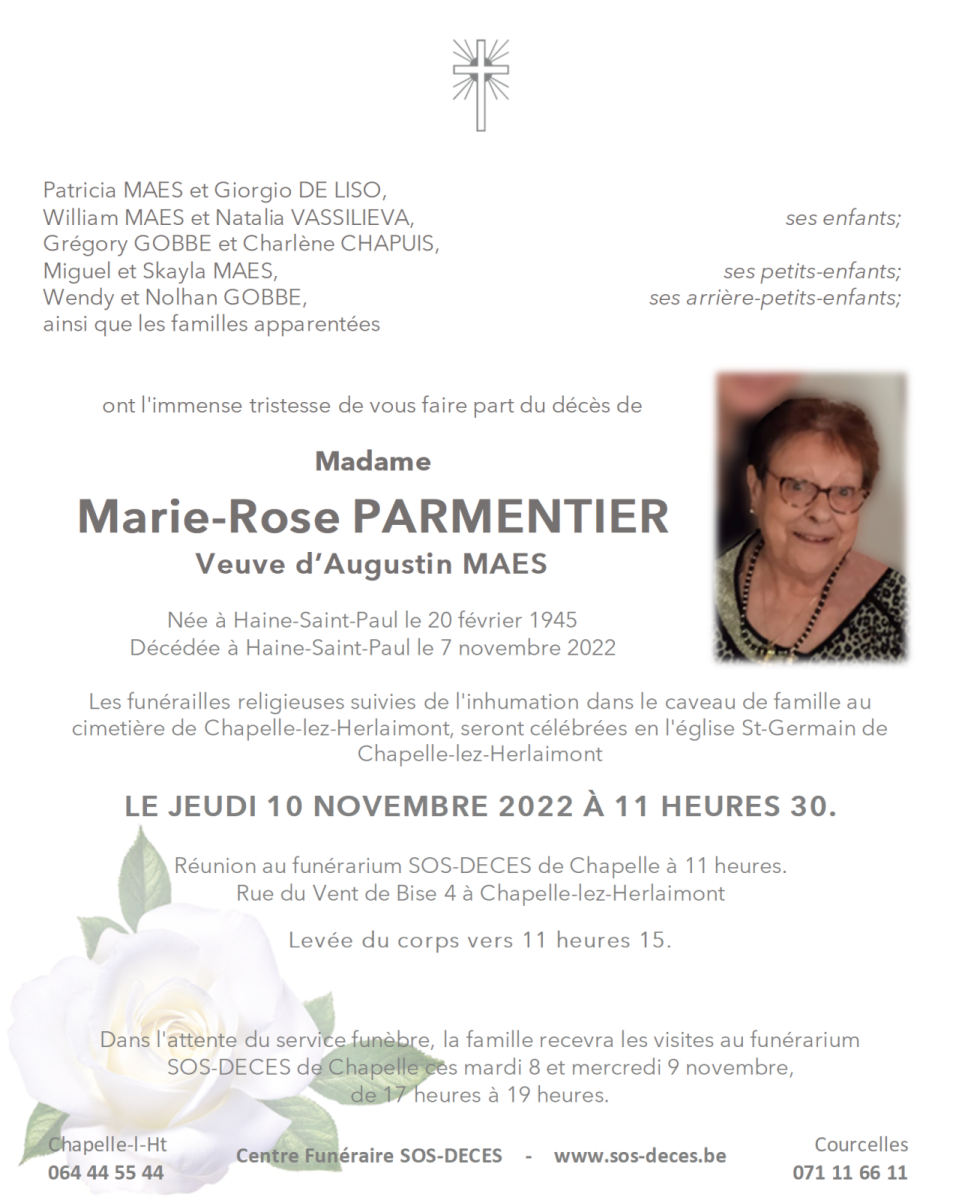 Décédée à Haine-Saint-Paul le 07 novembre 2022 à l'âge de 77 ans