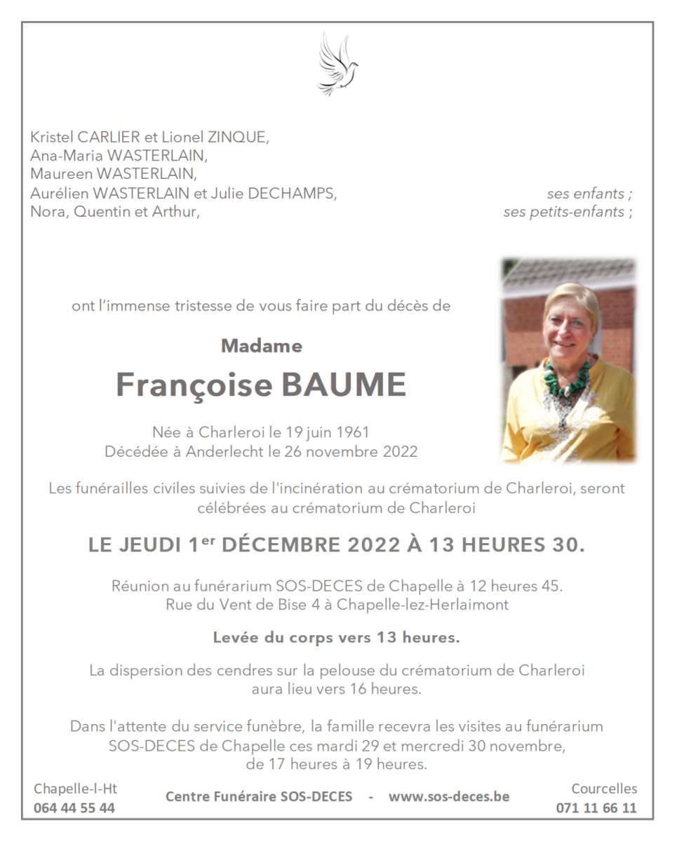 Décédée à Anderlecht le 26 novembre 2022 à l'âge de 61 ans