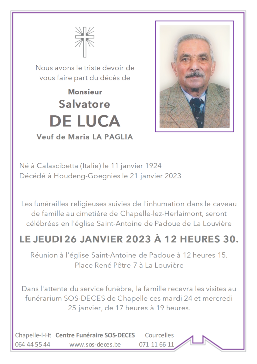 Décédé à Houdeng-Goegnies le 21 janvier 2023 à l'âge de 99 ans
