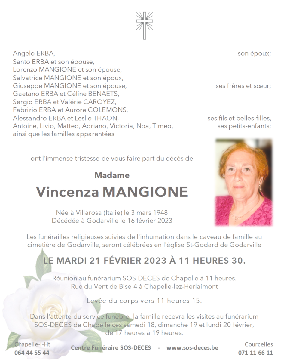 Décédée à Godarville le 16 février 2023 à l'âge de 74 ans