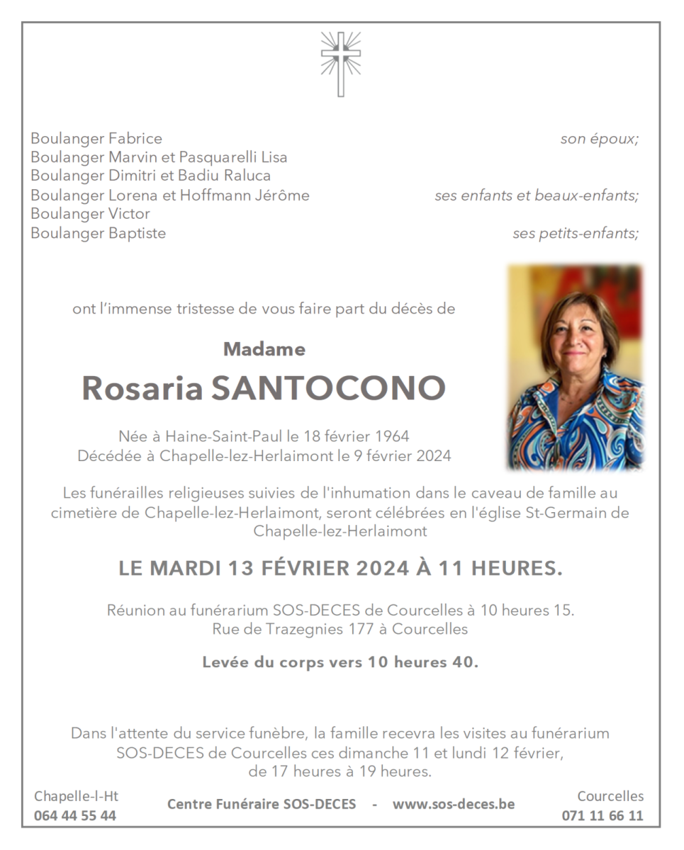 Décédée à Chapelle-lez-Herlaimont le 09 février 2024 à l'âge de 59 ans