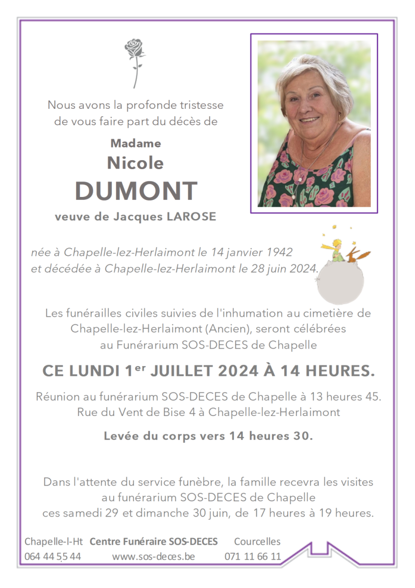 Décédée à Chapelle-lez-Herlaimont le 28 juin 2024 à l'âge de 82 ans