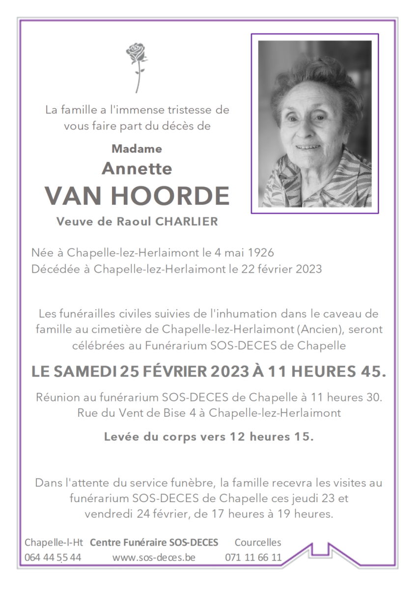 Décédée à Chapelle-lez-Herlaimont le 22 février 2023 à l'âge de 96 ans