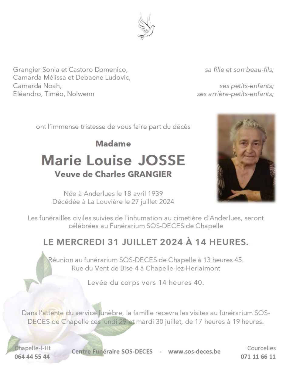 Décédée à La Louvière le 27 juillet 2024 à l'âge de 85 ans