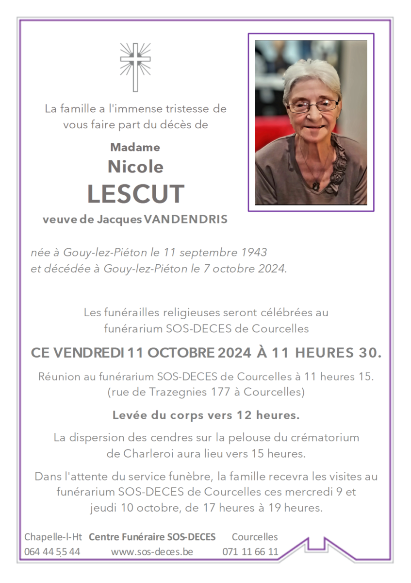 Décédée à Gouy-lez-Piéton le 07 octobre 2024 à l'âge de 81 ans