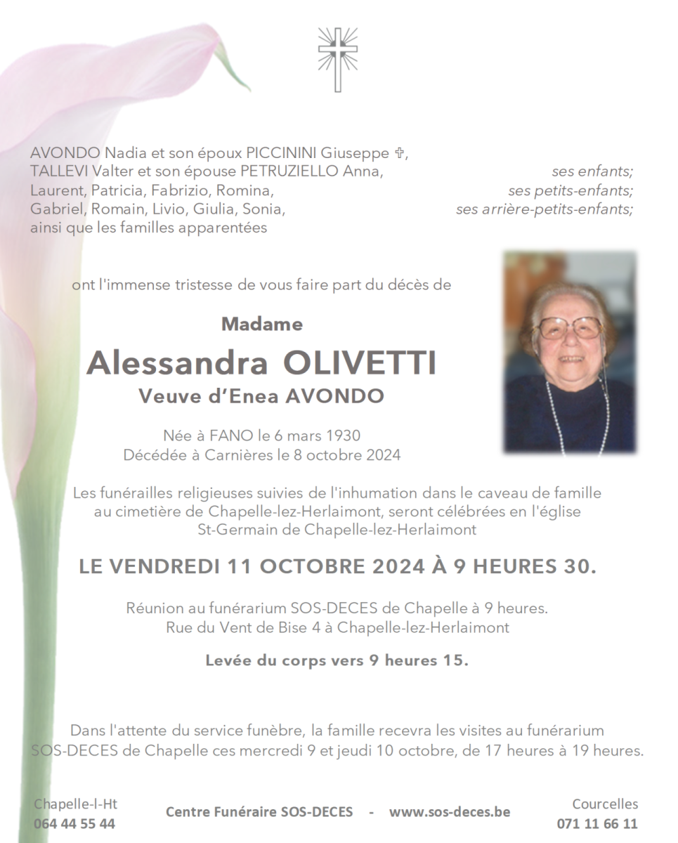 Décédée à Carnières le 08 octobre 2024 à l'âge de 94 ans
