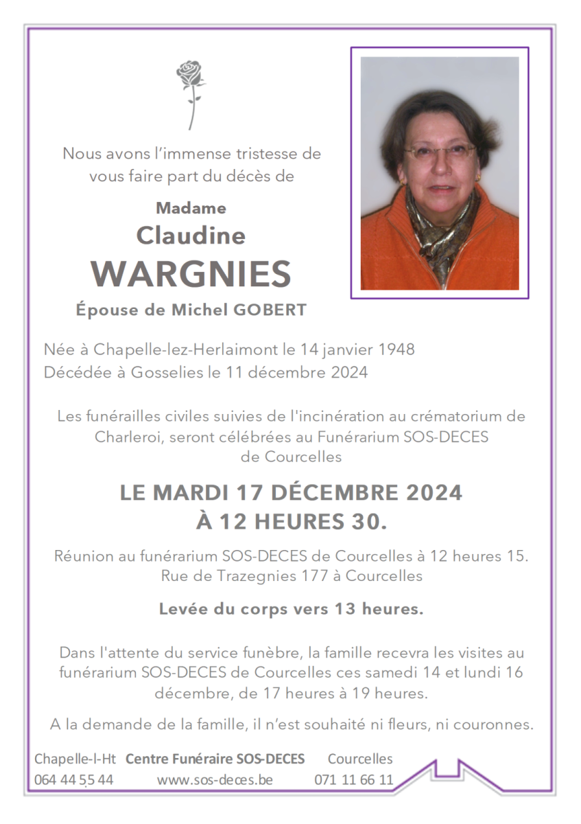 Décédée à Gosselies le 11 décembre 2024 à l'âge de 76 ans