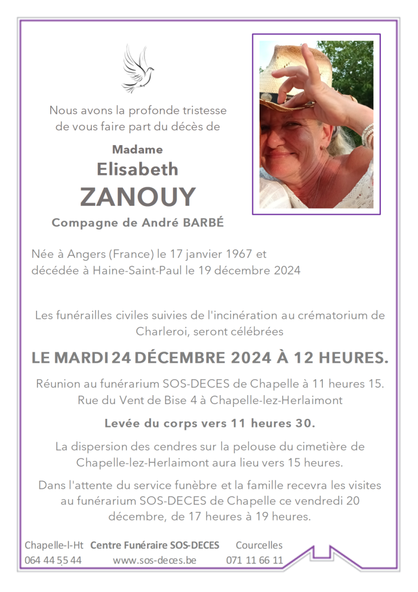 Décédée à Haine-Saint-Paul le 19 décembre 2024 à l'âge de 57 ans