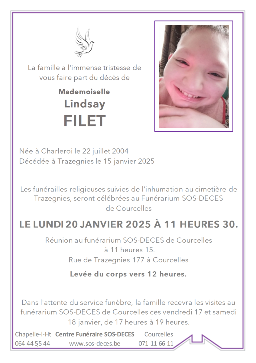 Décédée à Trazegnies le 15 janvier 2025 à l'âge de 20 ans