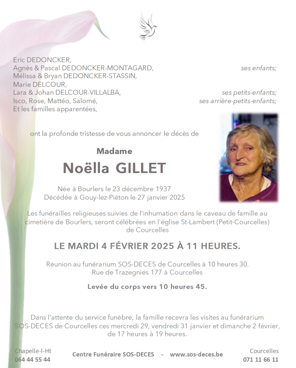 Décédée à Gouy-lez-Piéton le 27 janvier 2025 à l'âge de 87 ans