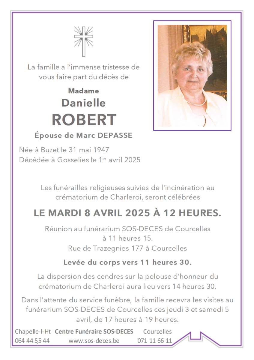 Décédée à Gosselies le 01 avril 2025 à l'âge de 77 ans