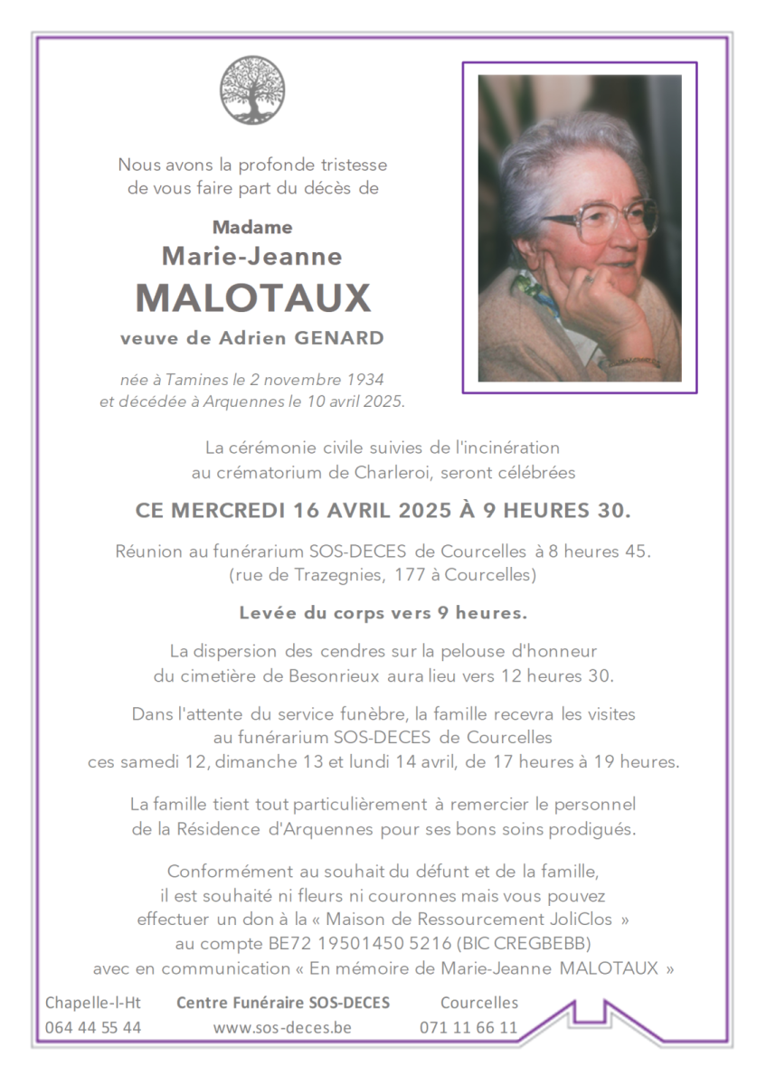 Décédée à Arquennes le 10 avril 2025 à l'âge de 90 ans