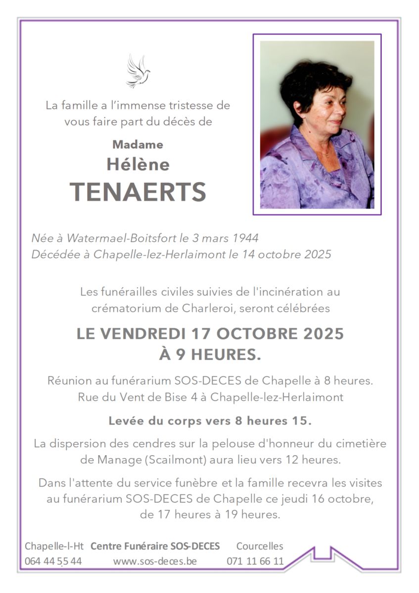 Décédée à Chapelle-lez-Herlaimont le 14 octobre 2025 à l'âge de 81 ans