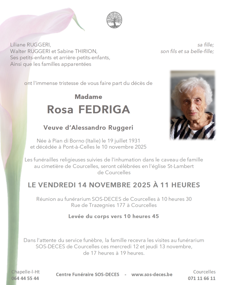 Décédée à Pont-à-Celles le 10 novembre 2025 à l'âge de 94 ans