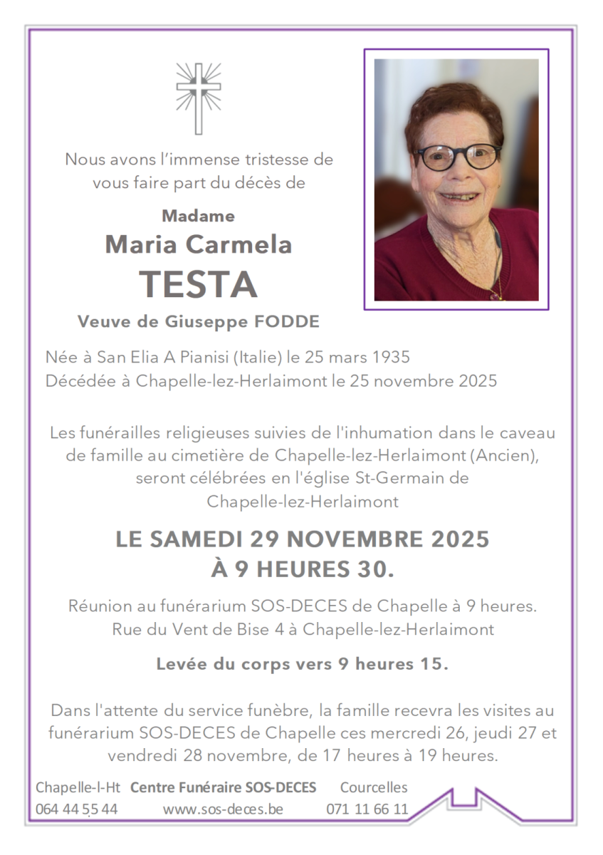 Décédée à Chapelle-lez-Herlaimont le 25 novembre 2025 à l'âge de 90 ans