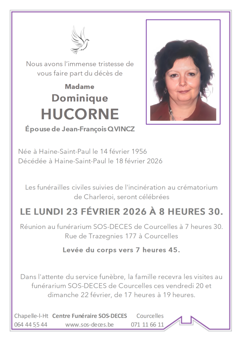 Décédée à Haine-Saint-Paul le 18 février 2026 à l'âge de 70 ans