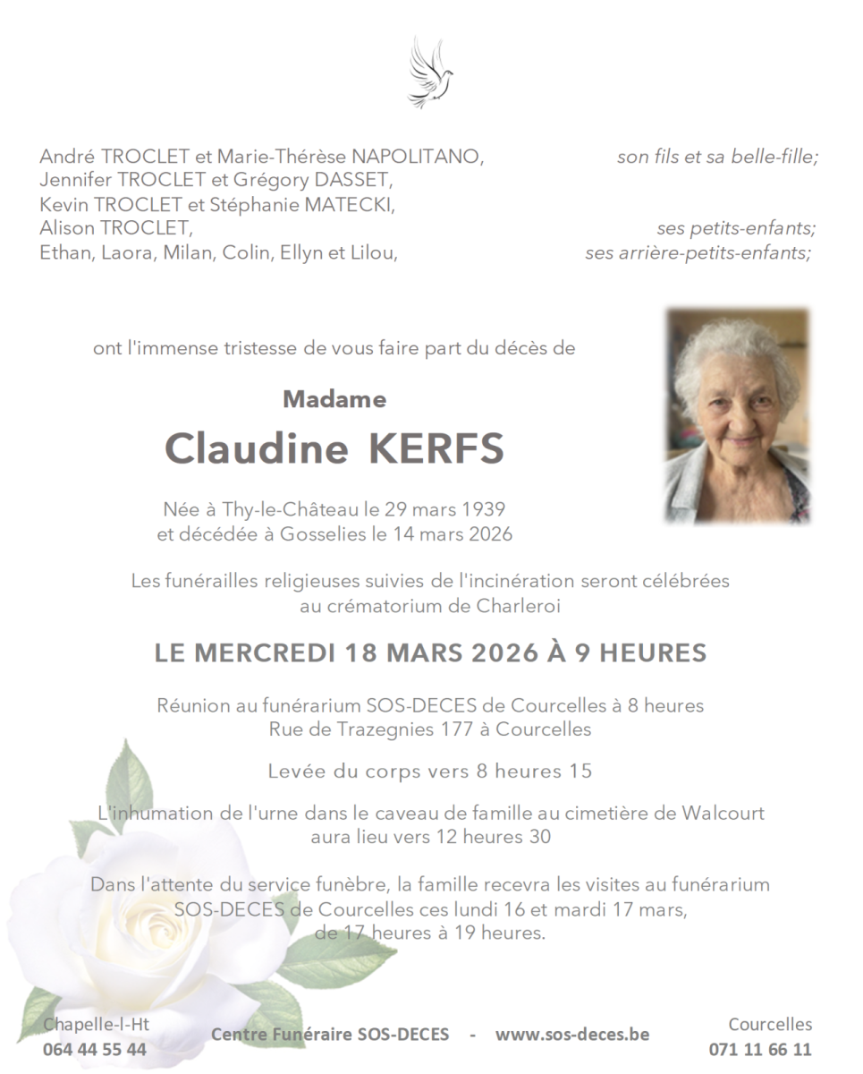 Décédée à Gosselies le 14 mars 2026 à l'âge de 86 ans