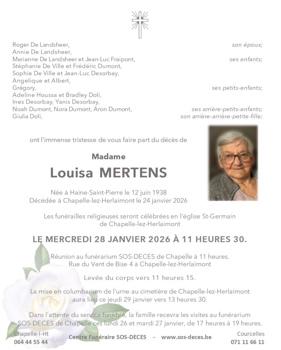 Décédée à Chapelle-lez-Herlaimont le 24 janvier 2026 à l'âge de 87 ans